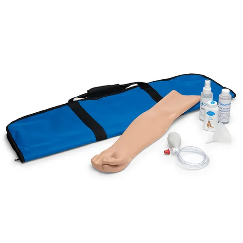 • Includes simulated blood concentrate, pressure bulb, blood dispensing bag, spare arm skin, funnel, powder, instruction manual, smoked Lucite® base with stand, and soft nylon carry bag