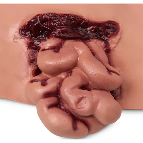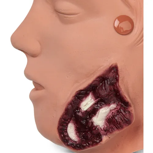 Can be used with any Rescue manikin, the WMD/CBRNE/DECON Full-Body Trainer (101-088FBU), or the Trauma CPR Manikin (100-2700U), (100-2725U). Application of these realistic bleeding moulages to a full-body manikin facilitates quick identification, diagnosis, and dressing of wounds by trainees. Kit includes compound fractures, contusions, lacerations, evisceration, sucking chest wound, impalement, crushed foot, jaw wound, and projectile entry and exit of arm. These bleeding wounds strap on and are complete with pump assembly. Simulated blood is included. Non-bleeding strap-on wounds include 2nd and 3rd degree burns of the chest, back, forearm, and face. Manikin sold separately.